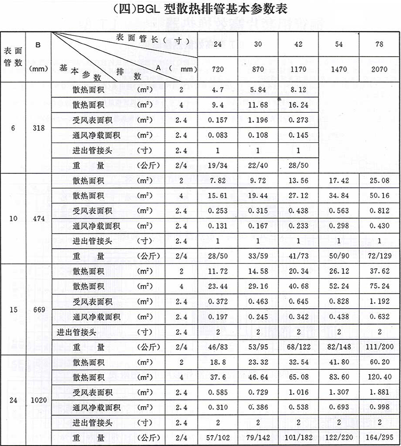 BGL型不锈钢散热排管,可分二排、四排、六排,当然也能制单排,以及其他非标形式,每种型号均有大小不同的规格,在此只标常规型号、规格。其中外壳、无缝不锈钢管¢18×2m/m均用1Cr18Ni9Ti材料,其翅片管用铝轧制而成,翅片管外径为¢38mm,根径为¢19mm,其片高为9.5mm,片距为R片(3m/m),翅片管呈螺旋状。